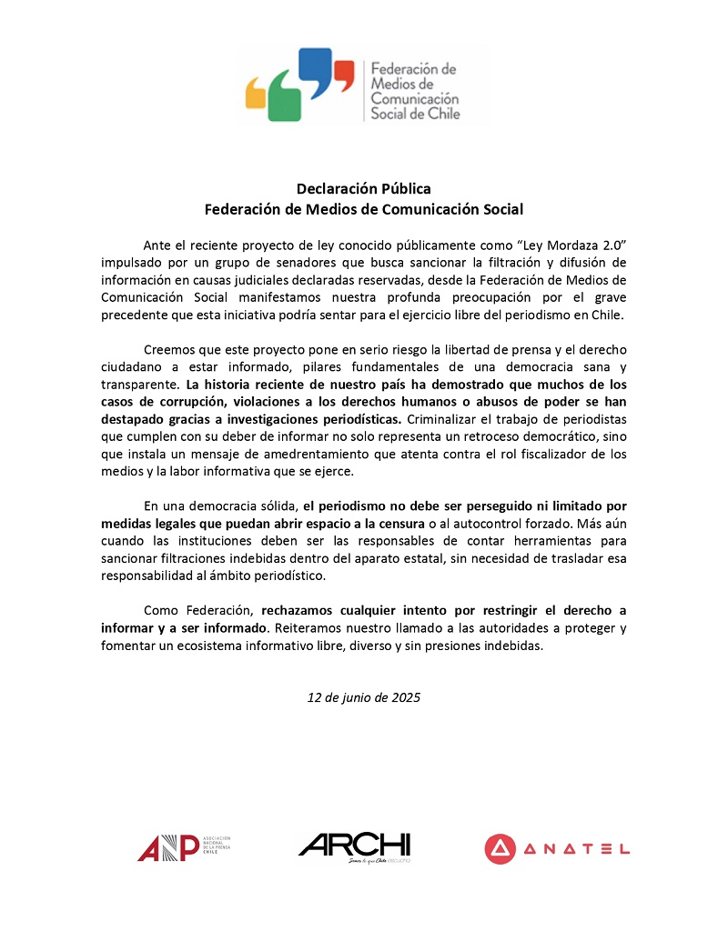 Federación de Medios de Comunicación rechaza proyecto de ley que amenaza la libertad de prensa